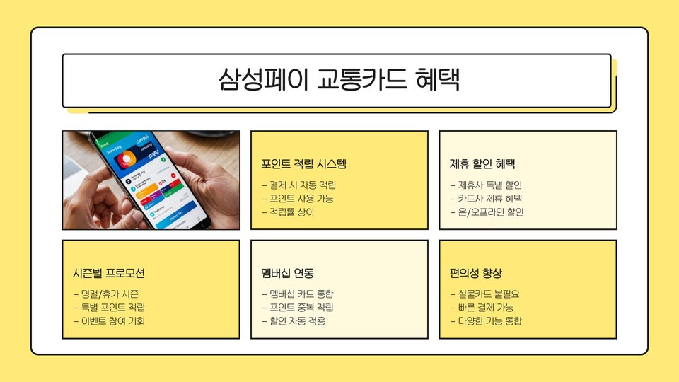 삼성페이 교통카드를 사용하면 여러 가지 장점이 있습니다. 첫 번째로, 편리함이 있습니다. 별도의 카드를 소지할 필요 없이 스마트폰만 있으면 언제든지 사용할 수 있습니다. 두 번째로, 안전성입니다. 분실 우려가 적고, 카드가 해킹당할 위험도 줄어듭니다. 세 번째로, 다양한 할인 혜택을 받을 수 있어 경제적인 이점도 큽니다.