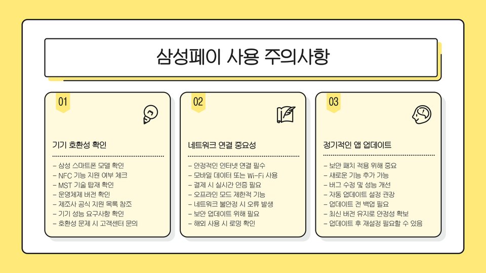 마지막으로, 사용 중 문제가 발생할 경우 삼성 고객센터에 문의하여 신속하게 문제를 해결할 수 있습니다. 특히, 카드 정보가 변경되거나 스마트폰에서 삼성페이 앱이 오작동할 때는 신속한 대응이 필요하며, 고객센터의 채팅이나 전화를 통해 도움을 받을 수 있습니다.