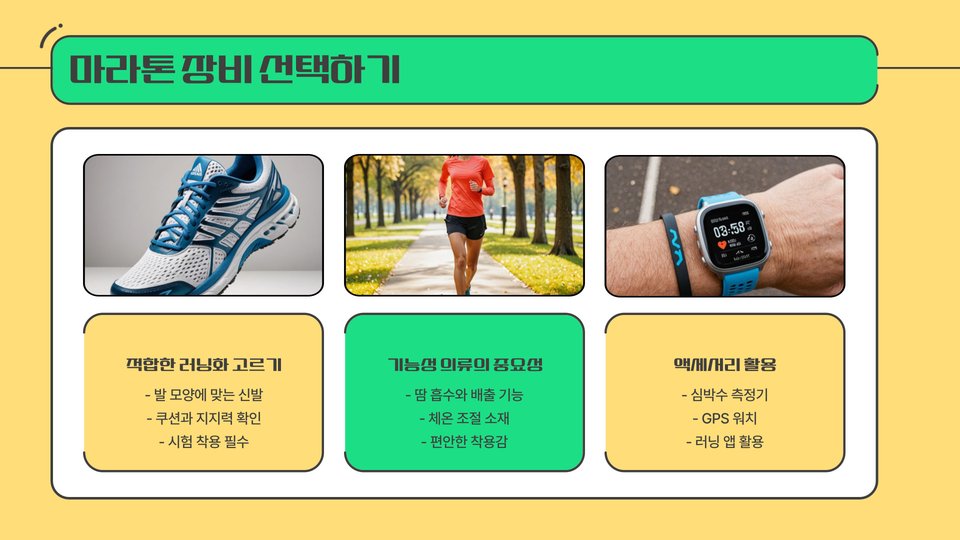 마라톤 훈련을 위한 적절한 장비는 부상 방지와 훈련의 효율성을 높이는 데 필수적입니다. 특히, 좋은 러닝화는 발의 피로를 줄이고 부상의 위험을 감소시킵니다. 또한, 통기성이 좋은 운동복과 적절한 액세서리(모자, 양말 등)도 고려해야 합니다. 기록을 위한 스마트워치나 앱도 유용합니다. 이러한 장비는 훈련의 질을 높이고, 동기를 부여하는 데에도 큰 역할을 합니다.