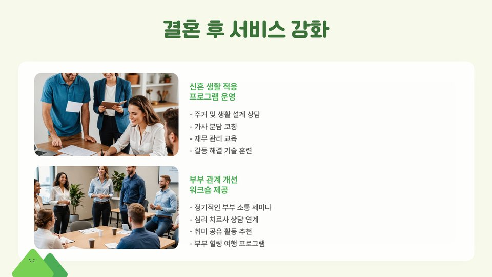또한, 결혼정보회사는 결혼 성공률을 높이기 위한 다양한 프로그램을 운영하고 있습니다. 예를 들어, 결혼 준비 과정에서 필요한 교육 프로그램이나 상담 서비스 등을 제공하여 고객이 결혼 생활에 대한 준비를 철저히 할 수 있도록 돕고 있습니다.