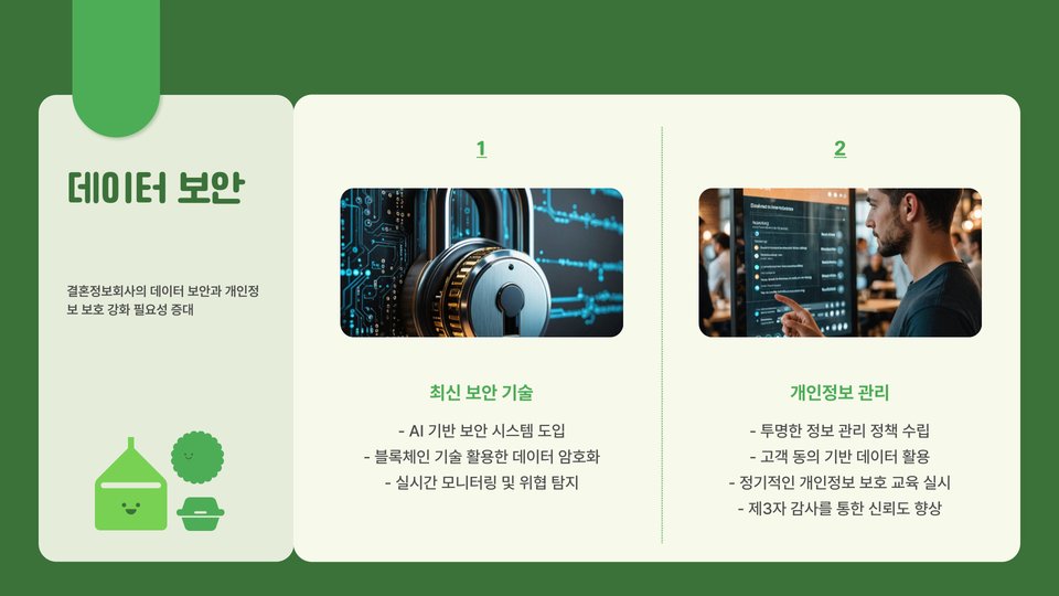 또한, AI 기반의 데이터 분석이 결혼정보회사의 중요한 요소로 자리 잡고 있습니다. AI는 고객의 성격, 관심사, 라이프스타일 등을 분석하여 더욱 정교한 매칭을 가능하게 합니다. 이는 결혼정보회사의 경쟁력을 높이는 중요한 요소입니다.