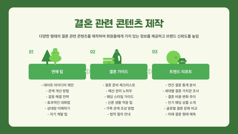 결혼정보회사들은 변화하는 사회적 트렌드와 고객의 요구에 발맞춰 혁신적인 서비스를 제공해야 합니다. 2025년에는 더욱 다양한 서비스 모델이 등장하고, 이를 통해 고객의 결혼 경험을 확대할 것입니다. 또한, 디지털화나 AI 등의 기술을 통해 더욱 정교하고 개인화된 서비스를 제공함으로써 고객의 만족도를 높여야 합니다.