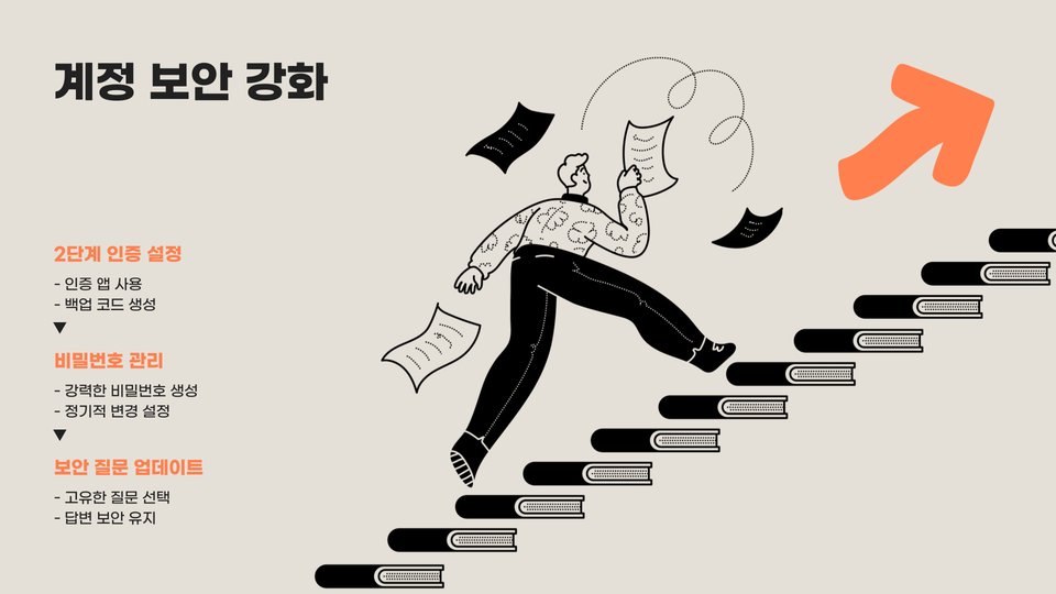 - 보안을 위해 비밀번호 변경 및 이중 인증 기능 활성화