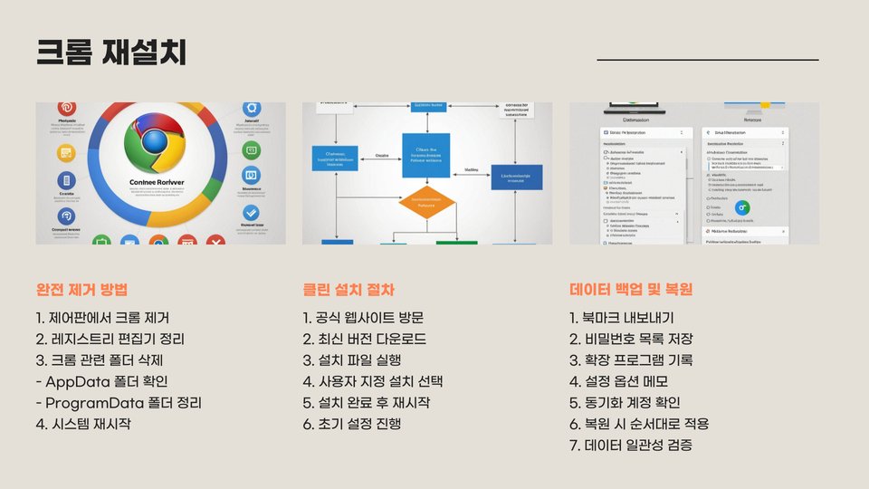 두 번째로, 크롬 재설치를 고려할 수 있습니다. 크롬을 완전히 삭제한 후 다시 설치하면 설정이 초기화되므로 로그아웃 문제가 해결될 가능성이 높습니다. 다만, 중요한 데이터는 미리 백업해 두는 것이 좋습니다.