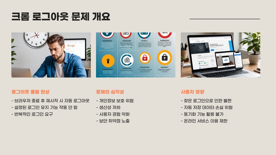 Tags: 크롬, 로그아웃, 풀림, 브라우저, 문제 해결, 캐시, 쿠키, 비밀번호 관리, 업데이트, 온라인 보안