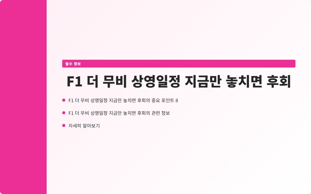 여러분, F1 더 무비 상영일정을 알고 계신가요? 이번 영화를 놓친다면 정말 후회할 수 있습니다! 흥미로운 이야기와 극장별 특전이 가득한 이 영화를 보고 싶으시다면, 지금 확인해보세요!