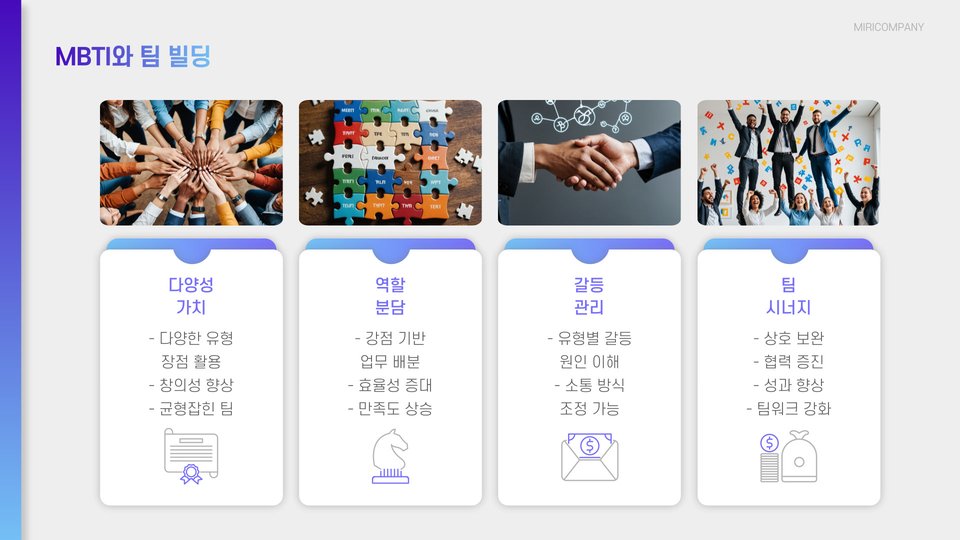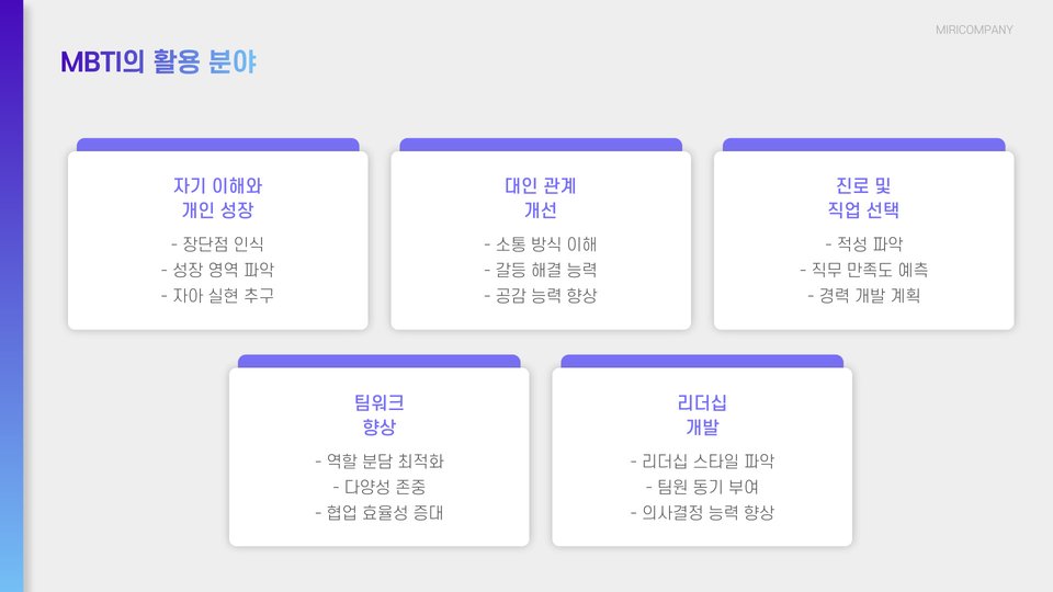 또한, 기업에서 인재 선발 및 직원 배치 시에 MBTI를 활용하여 각 팀원의 성격을 고려한 적합한 역할을 제공할 수 있습니다. 이 과정은 직원 개인의 능력을 극대화하는 데에 도움이 되며, 팀 전체의 효율성과 생산성을 증가시킬 수 있습니다.