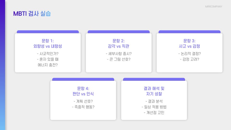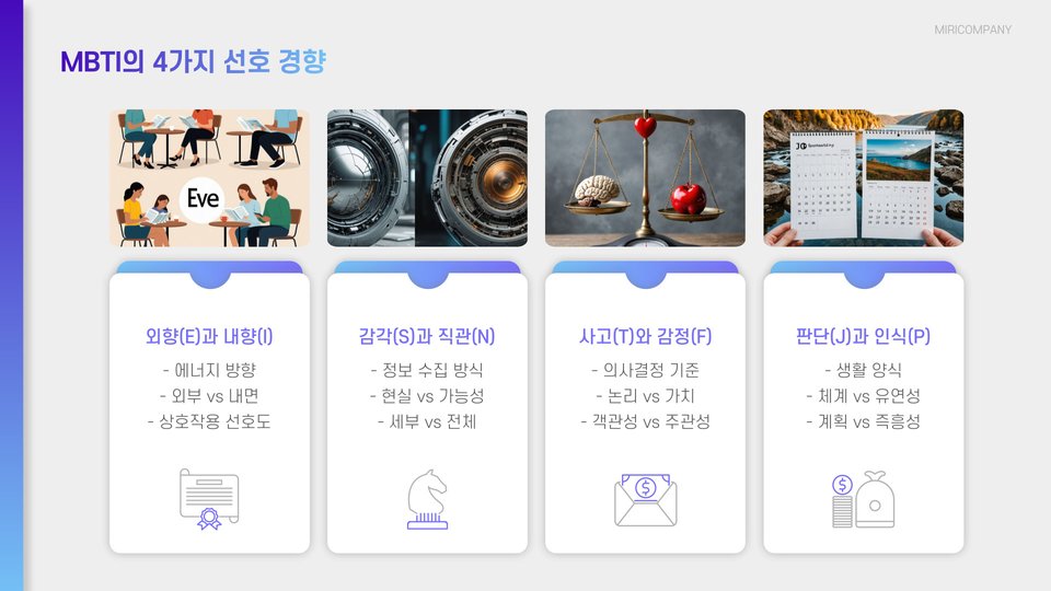 - MBTI 검사는 4가지 선호 쌍으로 나뉘어 있습니다.