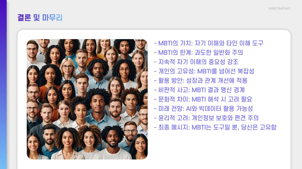 MBTI 검사는 개인의 성격을 이해하고, 대인 관계 및 직업 선택에 도움을 줄 수 있는 유용한 도구입니다. 하지만, 검사 결과를 절대적으로 믿기보다는 참고용으로 사용하는 것이 중요합니다. 이를 통해 자신과 타인을 이해하고, 보다 나은 삶을 살아갈 수 있는 기회를 만들 수 있습니다.