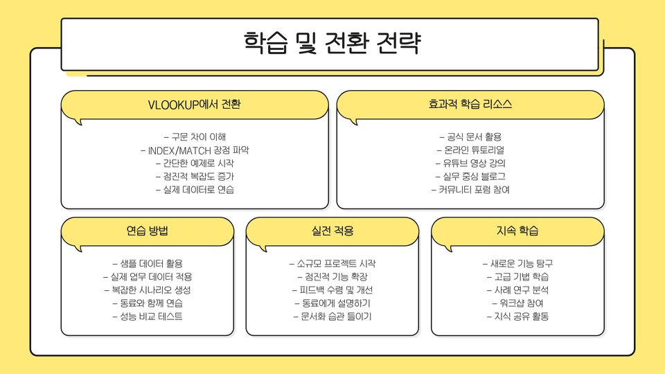 예를 들어, 여러 열에서 조건에 맞는 데이터를 빠르게 찾고자 할 때 index-match 함수를 사용하면 매우 효과적입니다. 이 방식은 데이터베이스가 커지더라도 성능 저하 없이 데이터를 검색할 수 있는 장점이 있습니다. 그러나 이 함수의 사용법은 vlookup에 비해 다소 복잡할 수 있어, 초보자에게는 배우는 데 시간이 걸릴 수 있습니다.
