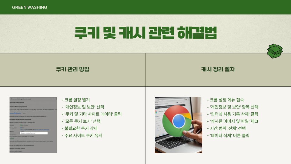 | 브라우저 캐시 과다 | 정기적으로 캐시 및 쿠키 삭제 |