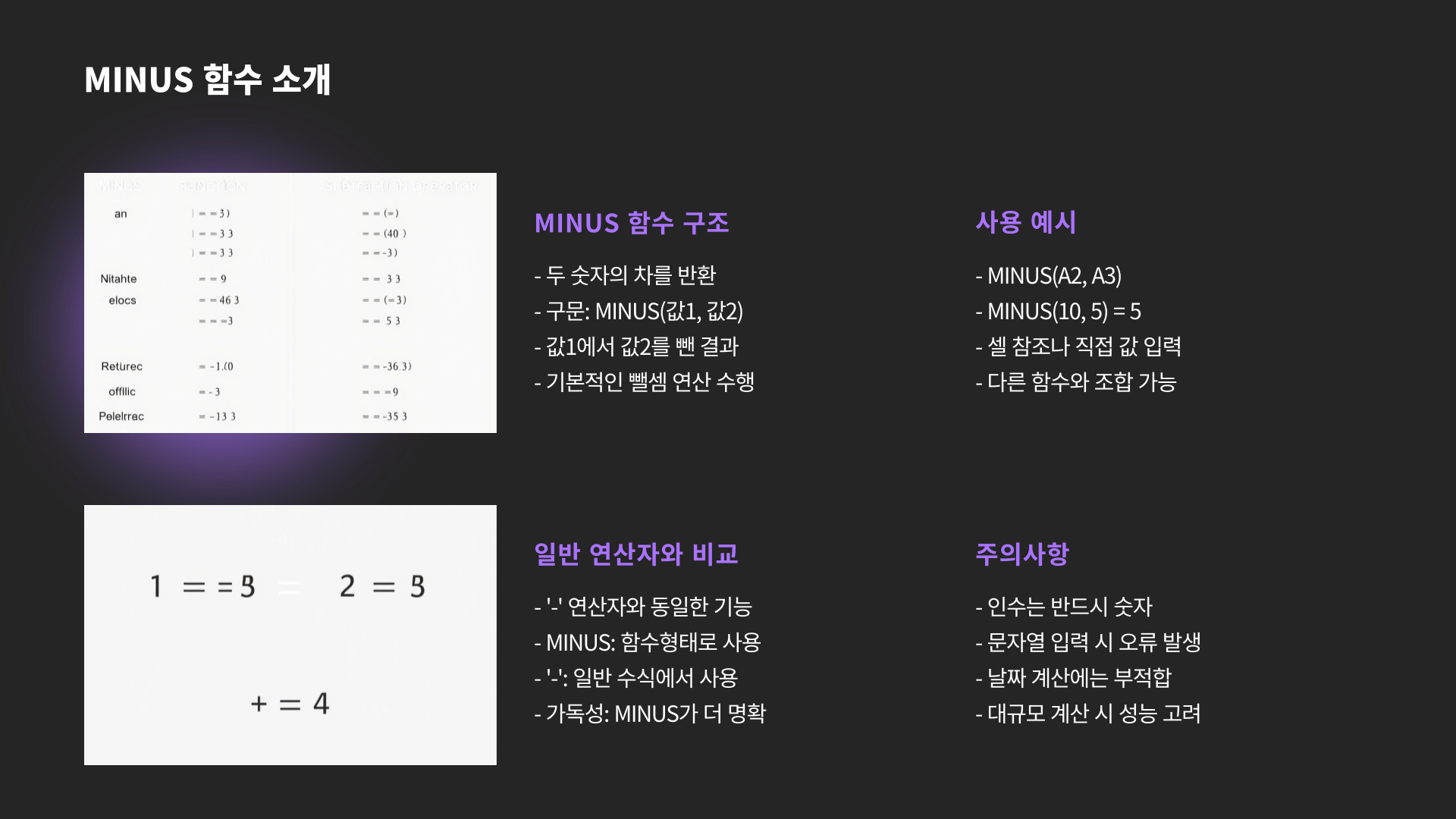 뿐만 아니라, 여러 조건에 따라 수식을 작성할 수도 있습니다. 예를 들어, 특정 조건을 만족하는 경우에만 빼기를 수행하는 IF 함수를 사용하여 더욱 복잡한 수식을 만들 수 있습니다.