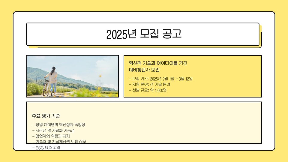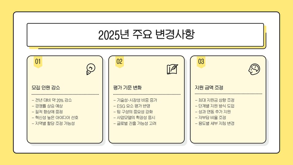또한, 2025년 예비창업패키지에서는 스타트업과의 연계를 통해 창업 후 지속적인 성장을 도울 수 있는 프로그램이 추가 됩니다. 이 참여자들은 다른 성공적인 스타트업과 연결되어 경험을 공유하고, 창업자가 직면할 수 있는 다양한 문제를 해결할 수 있는 네트워크를 형성할 수 있습니다. 이를 통해 사업 아이디어를 구체화하고 실제 실행에 옮기는 데에 큰 도움이 될 것입니다.