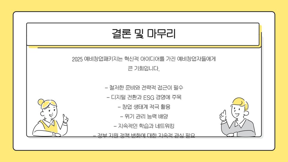 예비 창업을 고려 중인 모든 분들께, 충분한 정보 수집과 준비를 통해 성공적인 창업 여정을 시작하시기를 권장합니다. 그리고 끊임없이 배움을 추구하는 자세가 중요합니다. 예비창업패키지를 통해 제공되는 다양한 자원과 네트워크를 적극 활용하십시오.