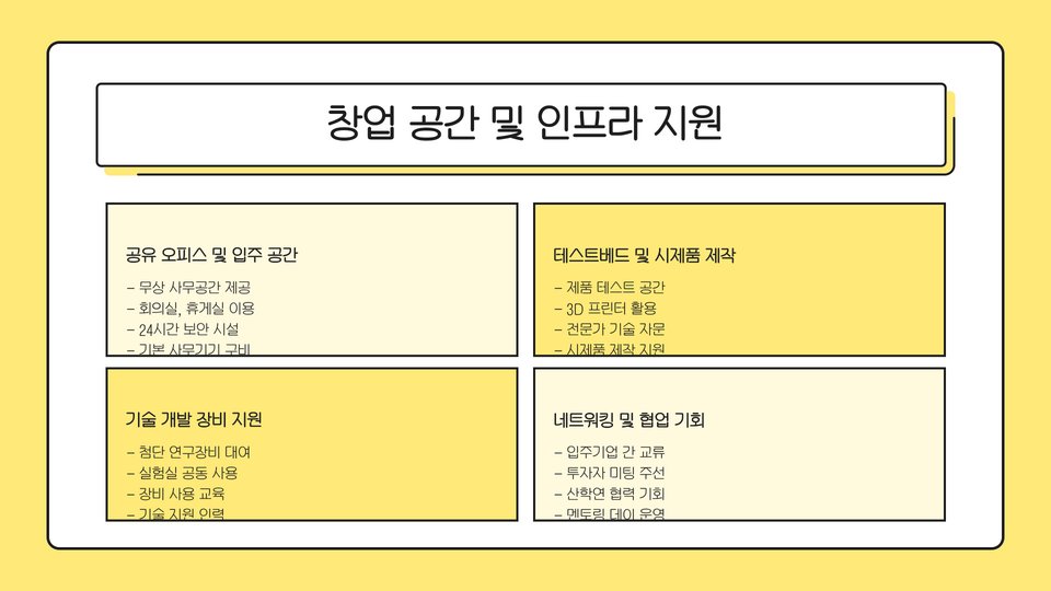 - 창업 교육: 창업에 필요한 기본 지식과 기술을 배울 수 있는 교육 프로그램이 제공됩니다.