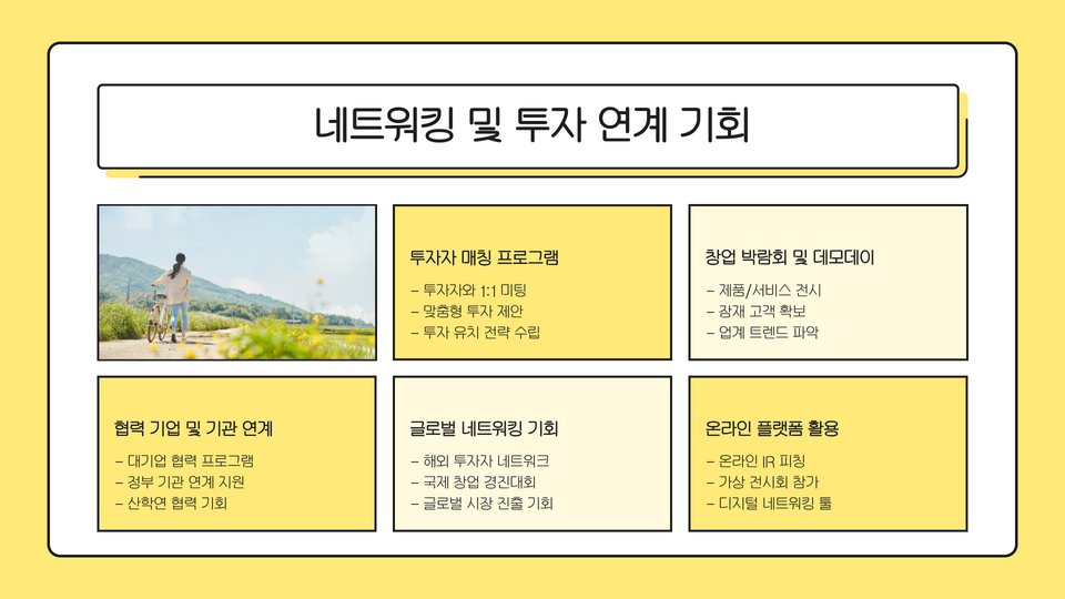 - 멘토링 프로그램: 경험이 풍부한 창업 멘토와의 1:1 멘토링을 통해 실질적인 조언을 받을 수 있습니다.
