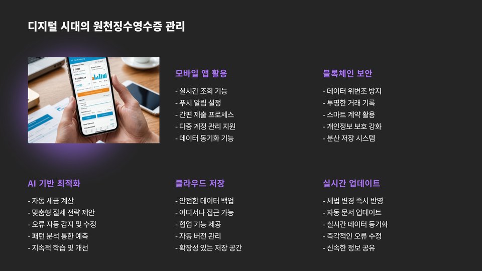 원천징수영수증은 세금 신고와 관련하여 매우 중요한 서류입니다. 디지털 플랫폼을 활용하고, 정확한 정보를 입력하며, 원천징수영수증을 다양한 용도로 활용하는 것이 성공의 열쇠입니다. 이러한 방법들을 통해 여러분도 원천징수영수증을 효과적으로 관리하고 활용할 수 있을 것입니다.