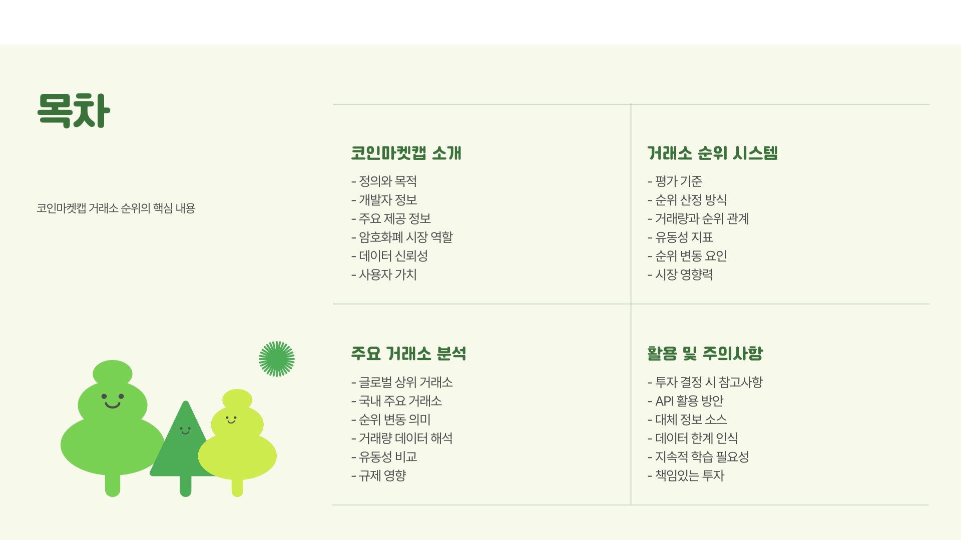 - 거래량: 거래소의 유동성을 나타내며, 높은 거래량은 거래가 원활하게 이루어질 가능성이 높습니다.